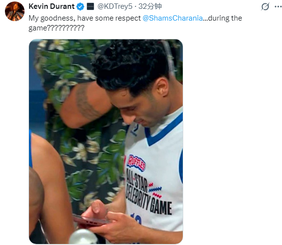 由于干涉全明星名东说念主赛,shams错失报说念拉文赛季报销的新闻,之后镜头拍到shams站在场边狂刷手机,如斯举动引热议,好意思媒捉弄,shams打名东说念主赛还在看手机,全王人莫得休息日;杜兰特晒出shams刷手机的画面,配文写说念:我的天呐,对比赛有点尊重好不好?在比赛中尽然这么?????